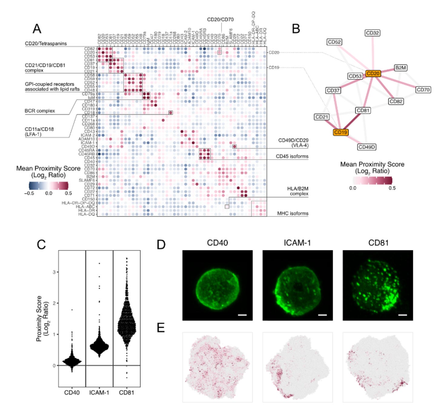The authors tested their Proximity Network Assay using Raji cells, a common B cell line, analysing over 1,000 cells to determine if PNA could accurately detect known protein partnerships. They sought classic protein complexes and membrane structures. The method successfully identified well-established interactions such as the B cell receptor complex (CD79a/IgM), integrin complexes, and membrane microdomains. To verify their computational predictions, they compared Proximity Scores with actual microscopy images and found strong agreement—proteins with low clustering scores, like CD40, showed even distribution under the microscope, while high-scoring proteins like CD81 exhibited the expected clustered patterns.