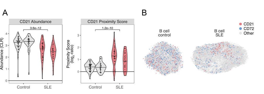 SLE is an autoimmune disease involving antibodies attacking the patient's own tissues, causing systemic inflammation and organ damage. Scientists have long known that CD21 is a crucial receptor that regulates B cell activation and is decreased in SLE patients (They frequently observed CD21low B cell populations in comparison to normal controls). The utilised PNA to survey two patients and two controls (granted it is a small population, but since it is a demonstration, let's overlook this). Their findings show that they could confirm lower expression of CD21 in patients as reported previously. Additionally, the PNA network demonstrated some level of polarisation that was not previously reported. The functionality of this polarisation is a bit speculative at the moment, but this is exciting as it offers a method to longitudinally study progressively degenerating diseases, not limited to SLE.